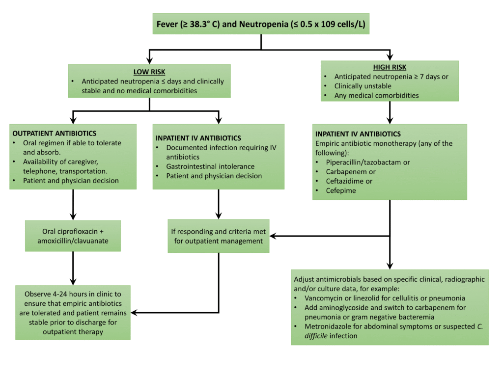 DEFINITION: Febrile neutropenia is defined as a one-time oral temperature of greater than 38.3°C (approximately 100.9°F) or a sustained temperature of greater than 38°C (100.4°F) for ≥ 1 hour in a patient who has an absolute neutrophil count of less than 500 cells/μL or an absolute neutrophil count expected to decrease to less than 500 cells/μL within a 48-hour period