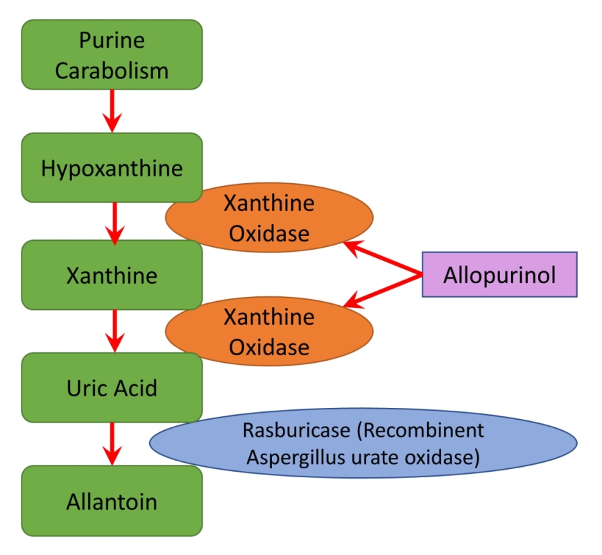 - Rasburicase – Recombinant Aspergillus urate oxidase that converts uric acid to allantoin. It is contraindicated in G6PD deficiency.
